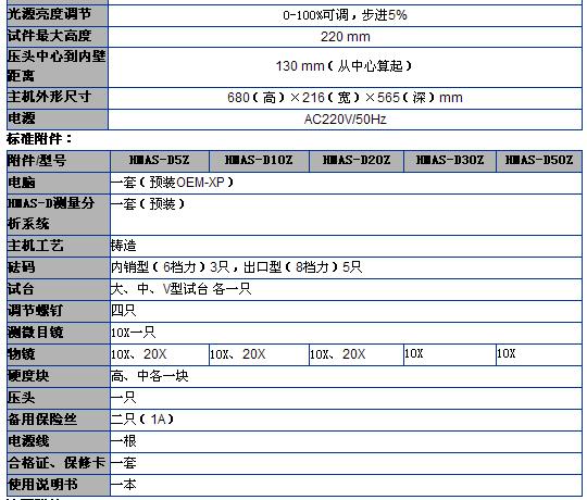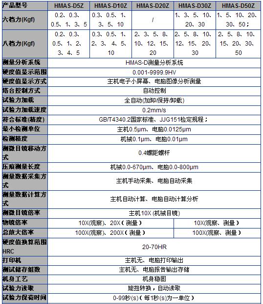 HMAS-D5Z/10Z/20Z/30Z/50Z維氏硬度測量分析系統(tǒng)是本公司推出的第六代光機(jī)電一體化的高新技術(shù)產(chǎn)品,該機(jī)器造型新穎,具有良好的可靠性,可操作性和直觀性,是采用精密機(jī)械技術(shù)、光電技術(shù)、圖形圖像處理技術(shù)和材料硬度分析軟件的新型維氏和努普硬度測試儀器。 性能特點(diǎn) 1、外觀新穎,采用微機(jī)控制自動(dòng)轉(zhuǎn)塔通過軟件執(zhí)行操作,進(jìn)一步實(shí)現(xiàn)測量的智能化。 2、設(shè)備擯棄傳統(tǒng)繁瑣測量步驟,測量方法更簡便 3、設(shè)備自帶打印功能,可將相關(guān)測量參數(shù)打印并保存 4、設(shè)備能對(duì)被測材料進(jìn)行拍攝并能對(duì)其組織進(jìn)行分析和讀取 5、可調(diào)節(jié)測量光源強(qiáng)弱,可預(yù)置試驗(yàn)力保持時(shí)間、并能切換維氏和努氏試驗(yàn)方法 適用范圍: 熱處理、碳化、淬火硬化層,表面覆層,鋼,有色金屬和微小及薄形零件等.配備努氏壓頭后能測定玻璃、陶瓷、瑪瑙、人造寶石等較脆而又硬材料的努氏硬度. 技術(shù)參數(shù):